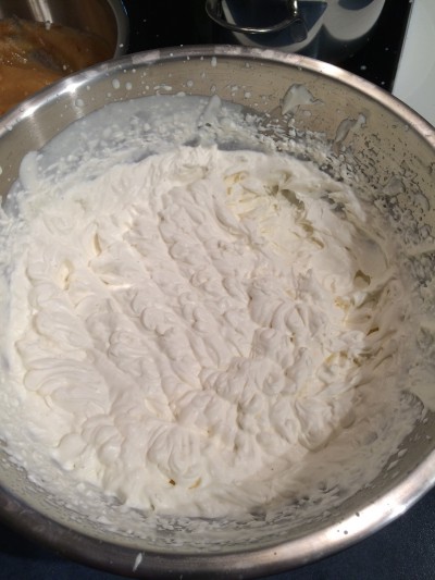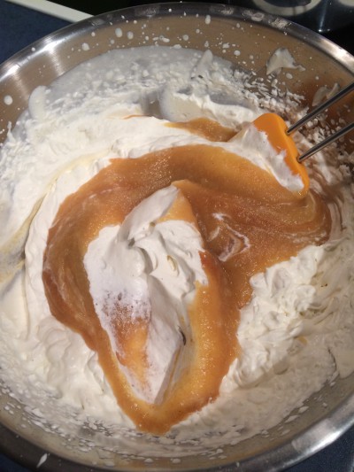 Weiter geht es mit der Füllung. Die Gelatine in kaltes Wasser legen und mindestens 10 Minuten einweichen. Schlagt die Sahne (500 gr.) mit dem Zucker (30r.) steif. Den Apfelmus mit dem Zimt und der steif geschlagenen Sahne mischen.