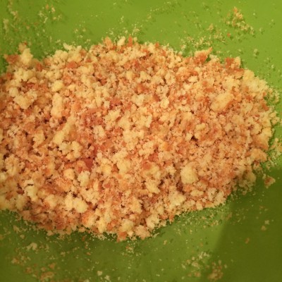 Wie gesagt – aus den Resten der Böden habe ich in einer Pfanne Brösel gemacht. Zum Eindecken die Sahne (200 gr.) steif schlagen und die Brösel unterheben.
