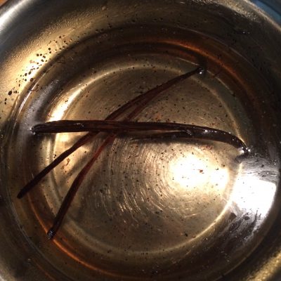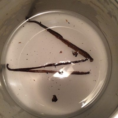 Das Mark von 2 Vanilleschoten auskratzen und dieses zusammen mit den Schoten selbst in die kochende Zucker-Wassermischung geben. Auf kleiner Flamme ca. 8-10 Minuten köcheln lassen.