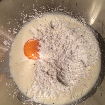 Währenddessen Stärke, Vanillemark und Eidotter in 100 gr. Sahne klümpchenfrei verrühren.