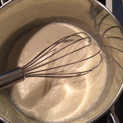 Wenn die Sahne kocht, die Stärkemischung unter gleichmäßigem Rühren in die Sahne rühren.
