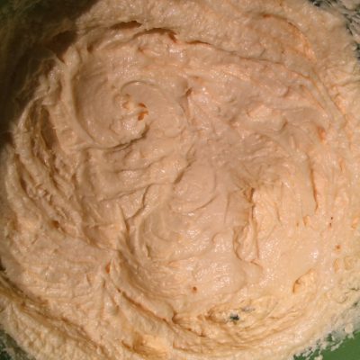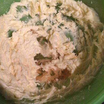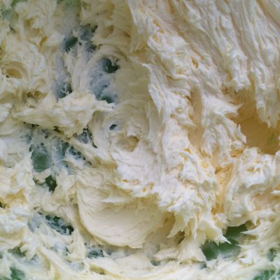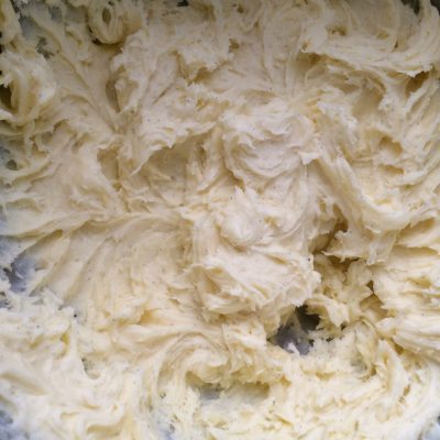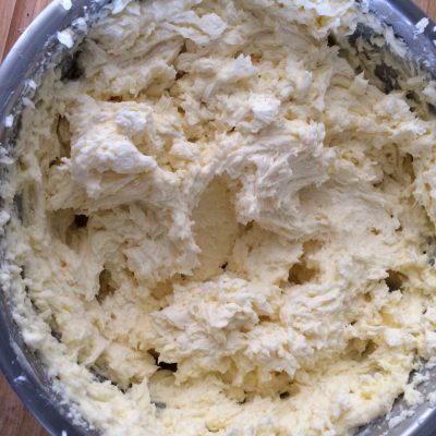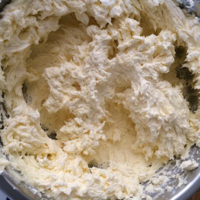 160 gr. Puderzucker, Vanillezucker mit 160 gr. Butter schaumig schlagen – einen Schuss (2cl – 20 gr.) Rum dazu.