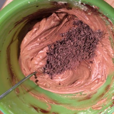 40g der Schokolade hacken und mit dem Teig vermischen.