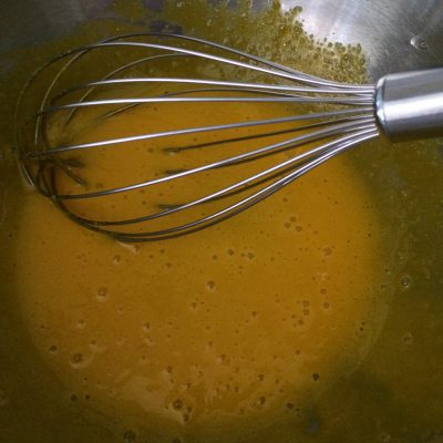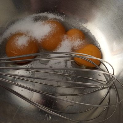 Die Eier trennen. In einer größeren Schüssel die vier Eigelb mit etwas Zucker schaumig schlagen. Mit einem Schneebesen, bis sich der Zucker gut aufgelöst hat.