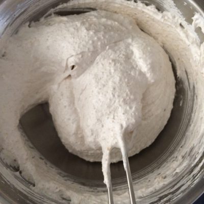 In einer zweiten Schüssel die Eiweiß steif schlagen. Währenddessen den Zucker mit dem Vanillezucker einrieseln lassen. So lange schlagen, bis ihr eine feste Meringue-Masse habt. Das Eiweiß muss stabile Spitzen behalten, wenn ihr euer Handrührgerät herauszieht.