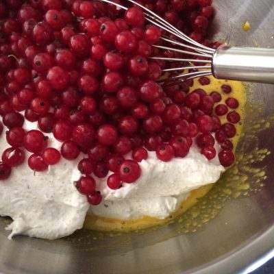 2/3 der Meringue-Haselnuss-Masse zu den schaumig geschlagenen Eigelb geben und vorsichtig unterheben. Dann die Johannisbeeren unterheben.
