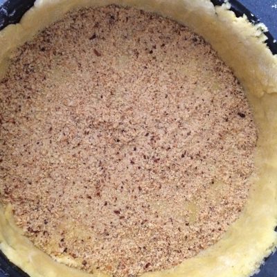 Der Mürbeteig sollte jetzt soweit sein, dass ihr ihn ausrollen könnt. Den Teig in die Springform legen und einen Rand formen. Dann bedeckt ihr ihn mit den zusätzlichen gemahlenen Haselnüssen. Das verhindert, dass der Mürbeteig sich vollsaugt und nicht richtig durchbackt.