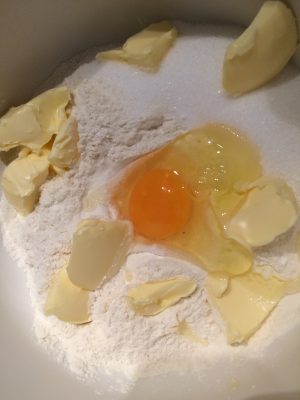 Zuerst stellt ihr aus den Zutaten für den Boden einen Teig her. Dazu gebt ihr die Zutaten in der aufgeführten Reihenfolge in eine Schüssel und knetet einen homogenen Teig.