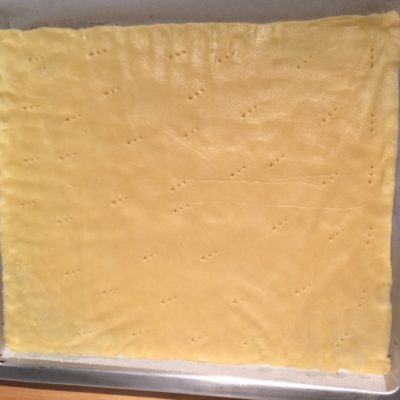 Den Teig habe ich dann zwischen zwei Lagen Backpapier grob in Form gerollt und dann auf das mit Backpapier ausgelegte Backblech gelegt. Drückt den Teig dann in die Form, bis er das Backblech vollständig und mehr oder weniger gleichmäßig ausfüllt.