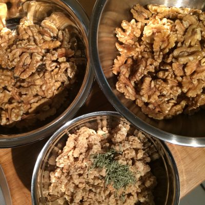 Dann 100 Gramm ganze Walnüsse in die Küchenmaschine und vorsichtig die Messer arbeiten lassen, bis die Walnüsse grob gehackt waren und auch zur Seite gestellt.
