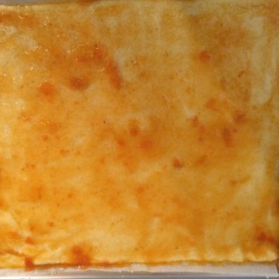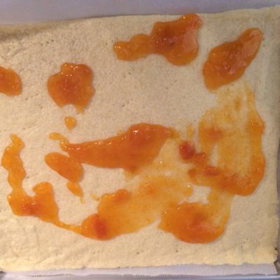 Mit einer Gabel mehrmals in den Boden stechen und dann in den vorgeheizten Backofen auf der mittleren Schiene für 10 Minuten vorbacken. Bestreicht ihn dann mit der Aprikosenmarmelade und lasst den Boden auf der Seite abkühlen.