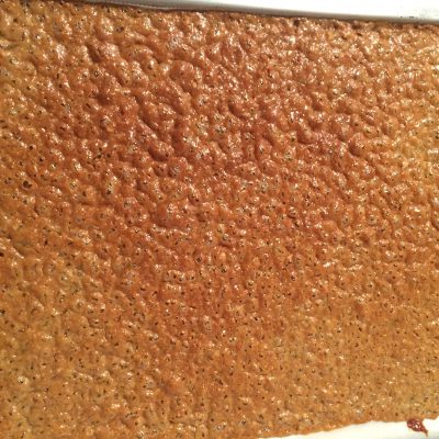 Wenn die Masse schön bräunlich ist, könnt ihr das Blech abkühlen lassen. Nach etwa 10 Minuten habe ich mit einem scharfen Messer die Ränder gelöst und alles auf mein Schneidebrett gezogen. Lasst es dort weiter abkühlen.