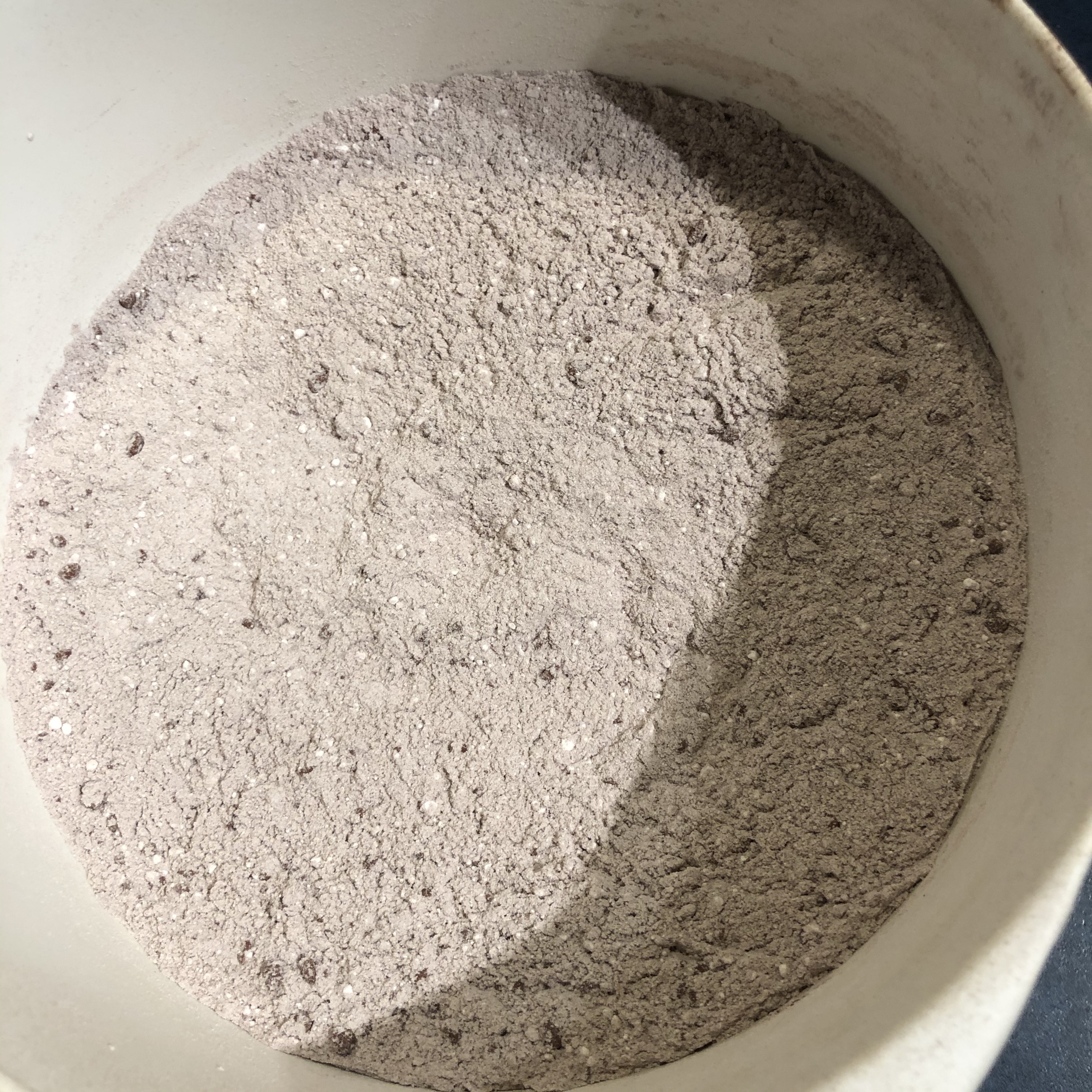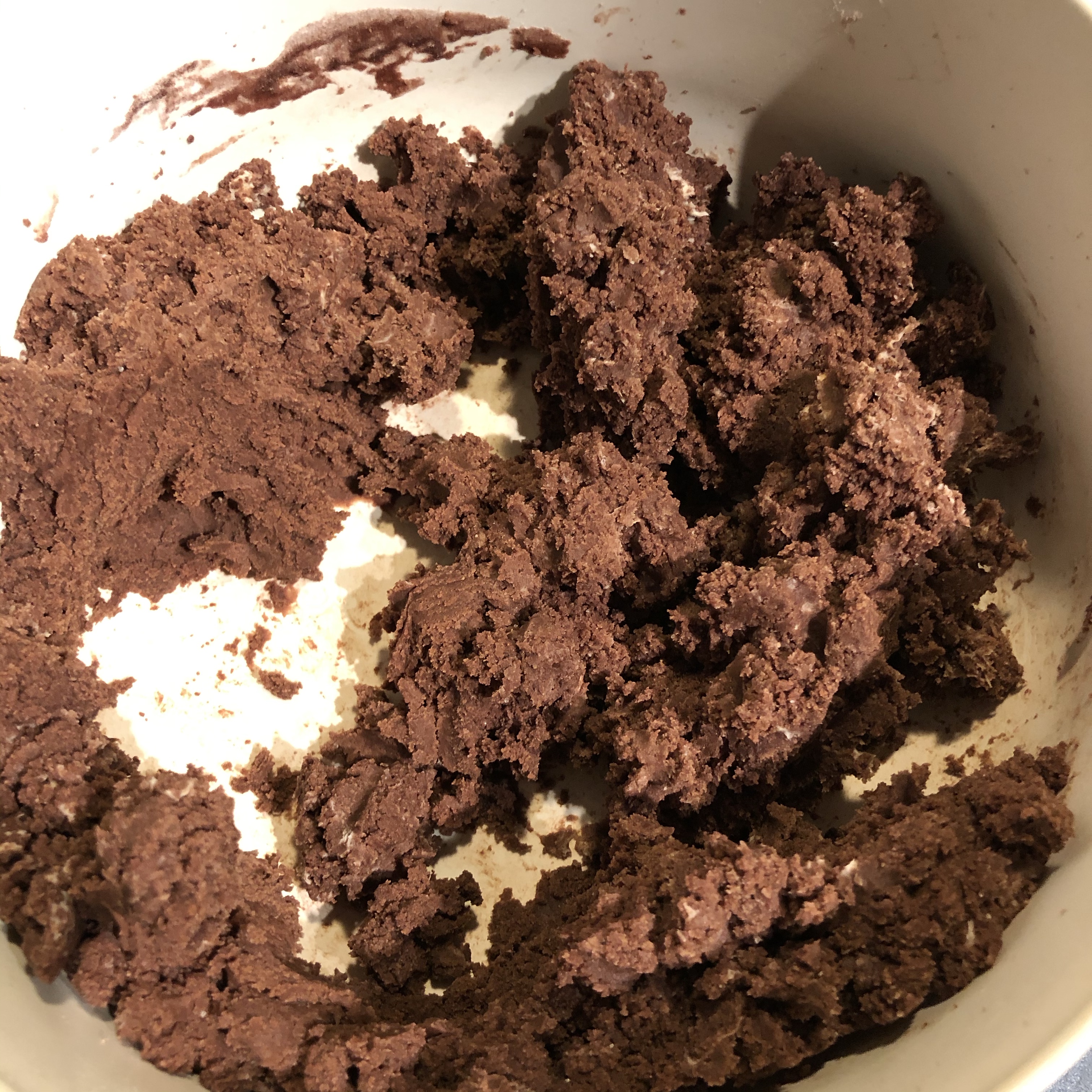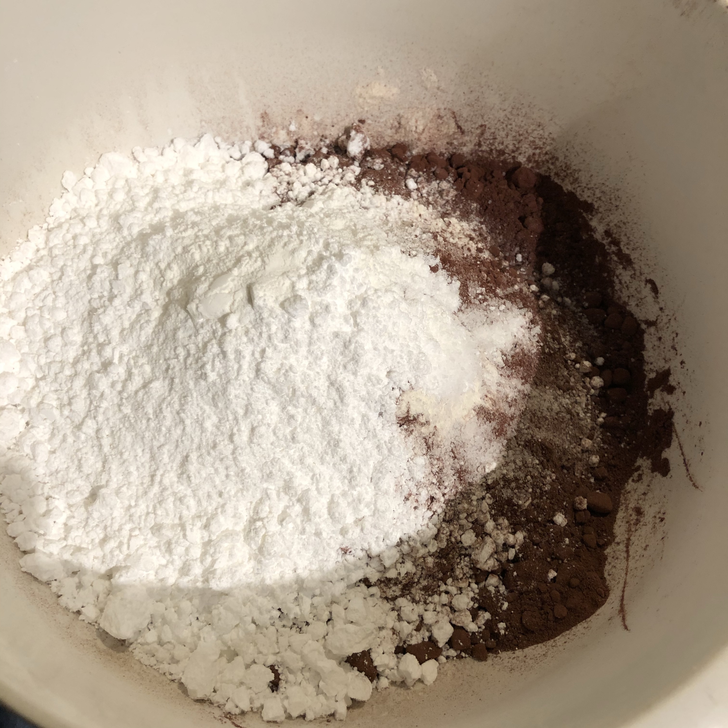 Für den Teig zuerst die trockenen Zutaten (Mehl, Kakao, Puderzucker, Backpulver, Salz) in einer Schüssel vermischen.