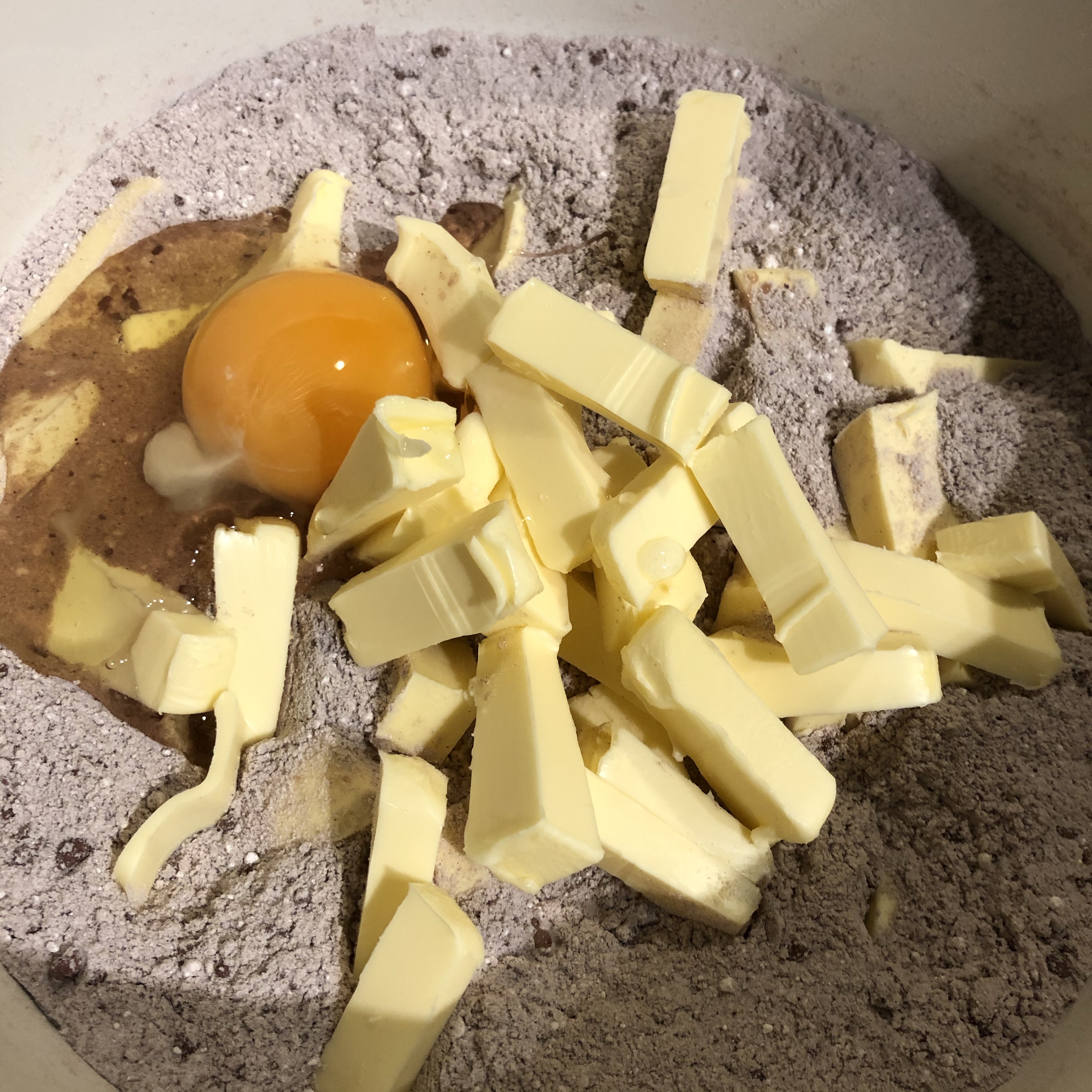 Die Butter in kleinen Würfeln und das Ei dazugeben.