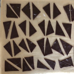 In der Abkühlphase könnt ihr dann die Plätzchen backen. Den Teig schön dünn ausrollen und jetzt habt ihr wieder die Wahl was die Form angeht. Wichtig ist nur, dass ihr immer ein Paar habt, das zusammen passt. Ich habe mit einem Pizzaroller Quadrate ausgeschnitten und diese diagonal geteilt. So hatte ich immer ein passendes Pärchen auf dem Blech. Natürlich gehen auch Herzen, Rentiere etc.