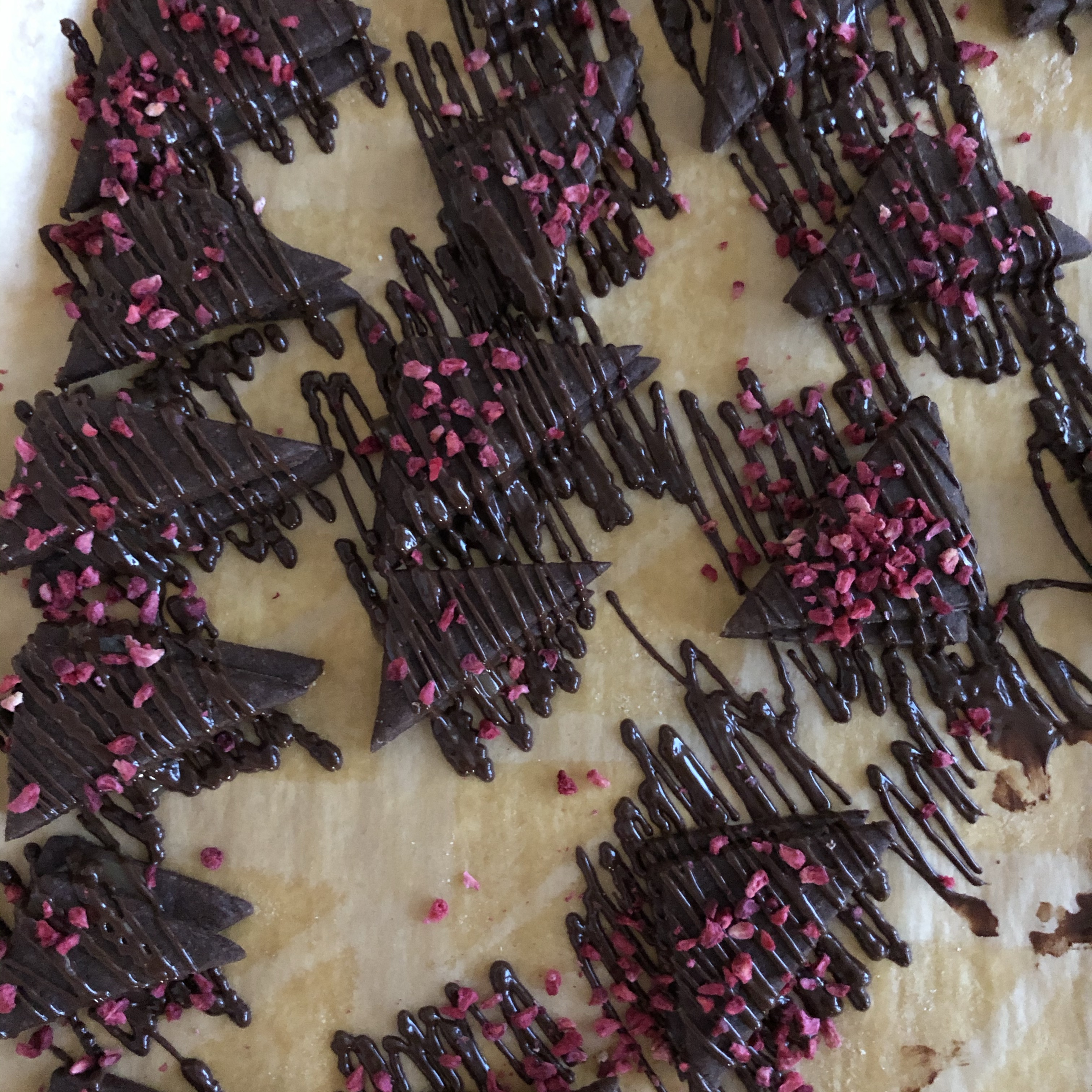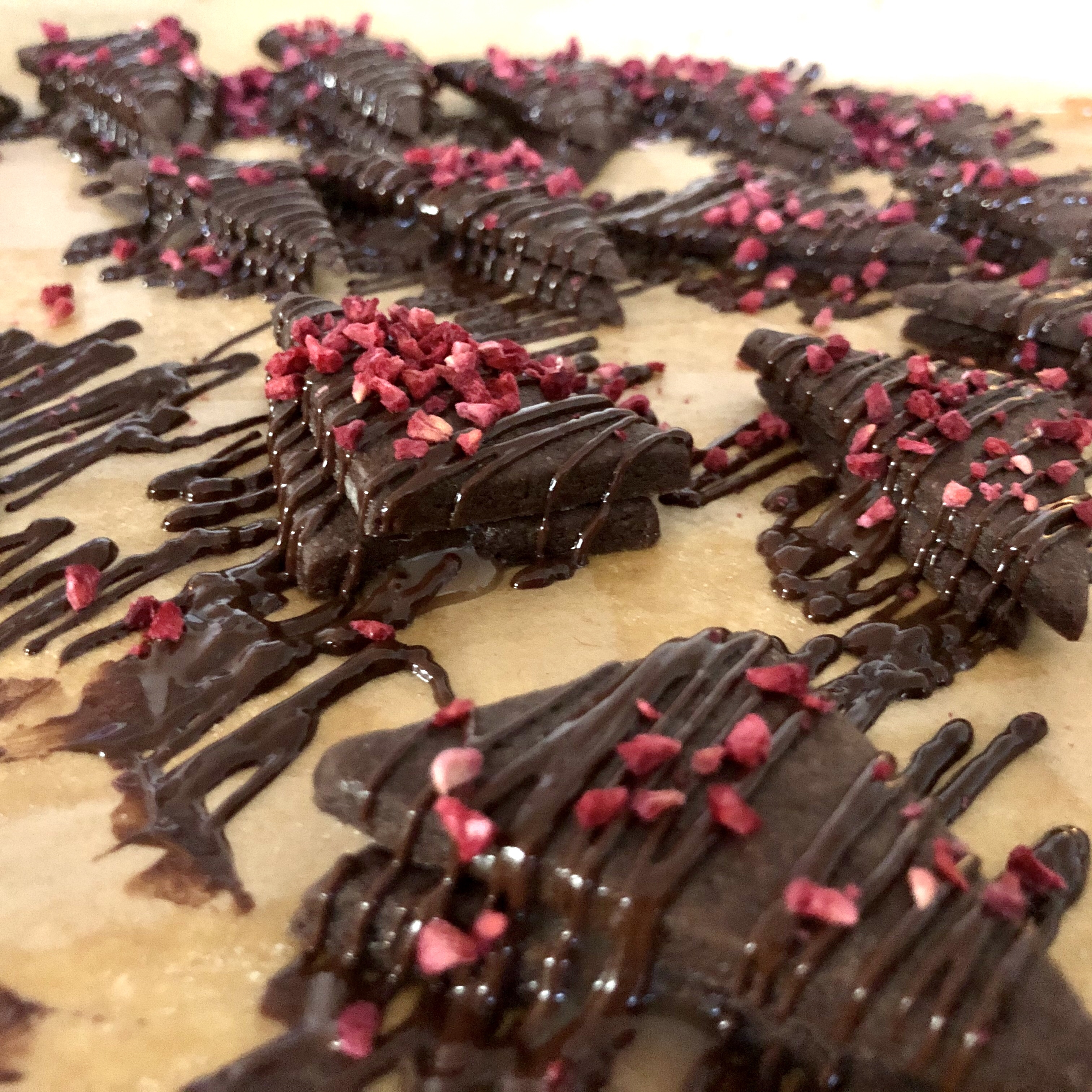 Gebt auf die eine Hälfte der Plätzchen die Karamellsoße, dann legt das Gegenstück darauf. Über das fertige Plätzchen dann die Schokolade und darauf dann die getrockneten, gehackten Himbeeren.