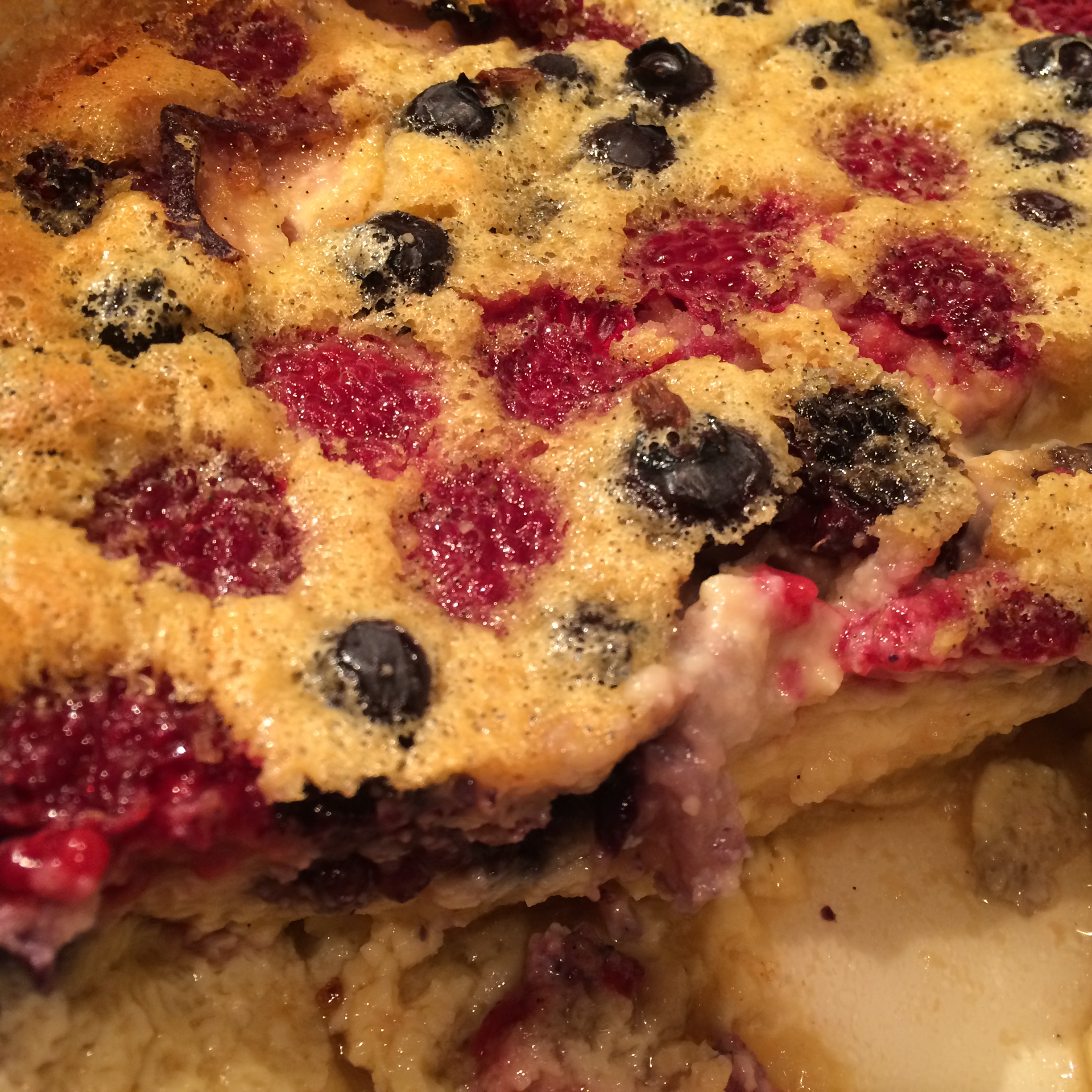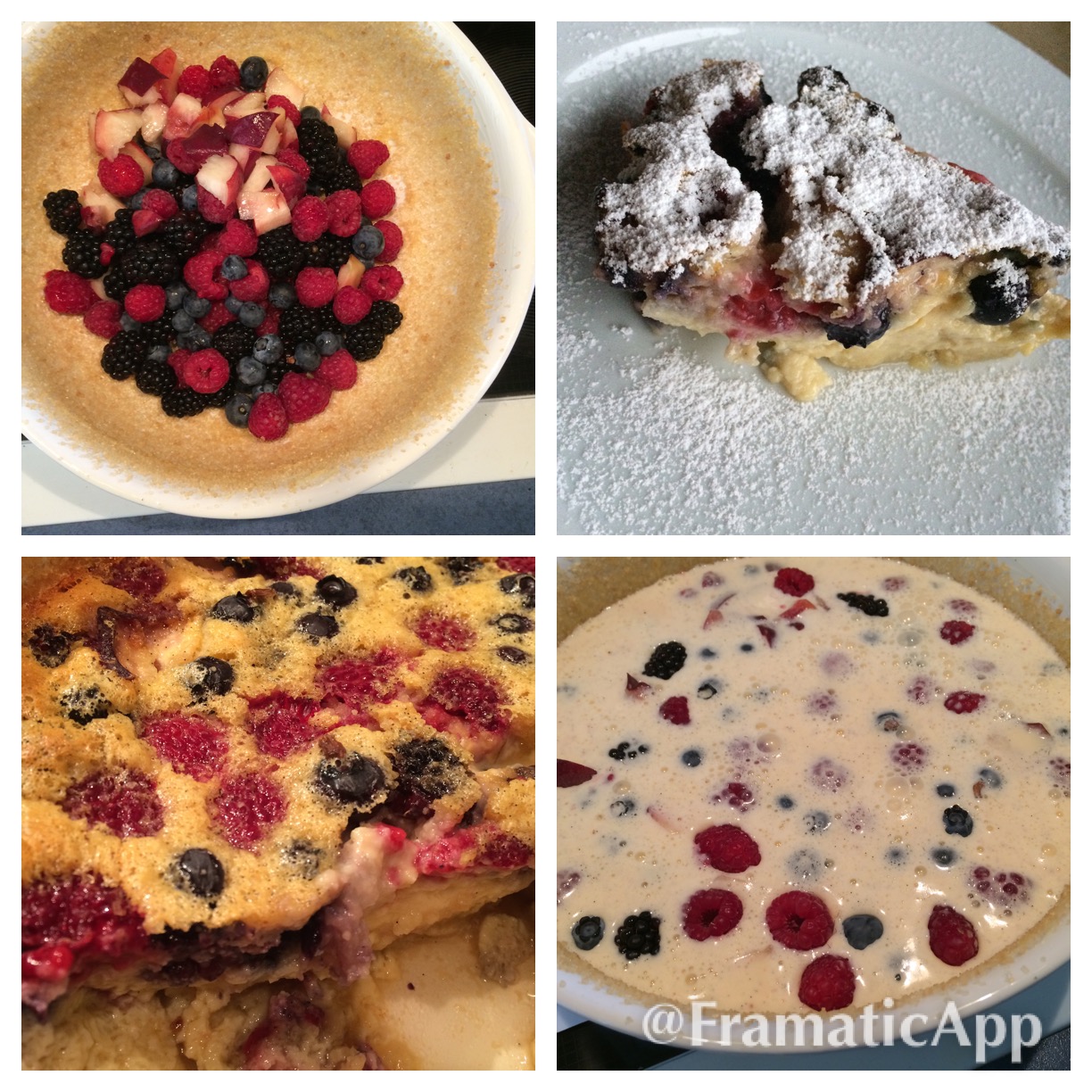 In ihrem Rezept hat Anja den Clafoutis mit Kirschen gemacht – optional waren laut Rezept 400 gr. Früchte nach Wahl. Der Zufall wollte es, dass es eine kleine Kommunikationsschwäche zwischen mir und meinem lieben Mann gab und statt der „400 gr. Himbeeren ODER was es gerade auf dem Wochenmarkt gibt“ wurde „400 gr. Himbeeren UND was es gerade auf dem Wochenmarkt gibt“. Was dazu führte, dass am Samstag dann verschiedene Schälchen mit Beeren in unserem Kühlschrank eingelagert wurden. Eines war mir klar – ich durfte auf keinen Fall reklamieren. Schließlich war ich es dieses Mal, der an diesem Samstag schön ausschlafen konnte und nicht morgens um 7.00 Uhr schon auf dem Wochenmarkt einkaufen musste.